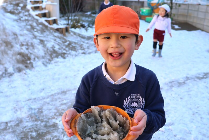 新しい1週間がはじまりました。強烈な寒さとともに……。きょうの朝の横浜の最低気温、いったい何℃だと思います? マイナス3.4℃ですって。これは、地上から1.5mの高さの気温ですから、地表面はおそらくもっと低いでしょう。この寒さですから、上空の雪は、そのまま地表まで溶けずに落ちてきますよね。きのうは、その「雪」がうっすらと積もりました。きのうのうちに溶けてしまった「雪」もありますが、きょうの朝、幼稚園に来てみますと、まだ手つかずの「雪」が園庭にしっかりと残っていました。