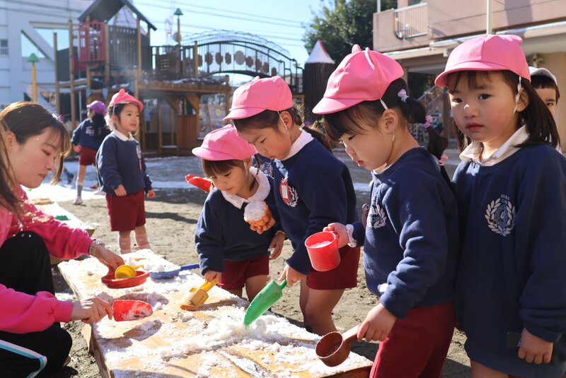 「いちご組」のお子さまたちも、あたらしく設置されたベンチの上で、思い思いに雪を調理中。新しいベンチは、まるで大きな「まな板」のようでした。
