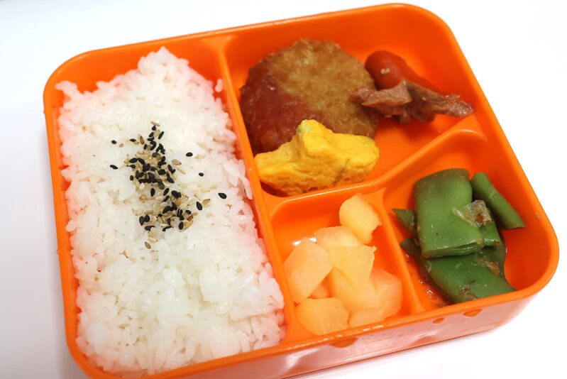 ごまふりかけごはん、メンチカツ、星型しんじょ、たこちゃんウィンナー、いんげんのおかか和え、リンゴ缶