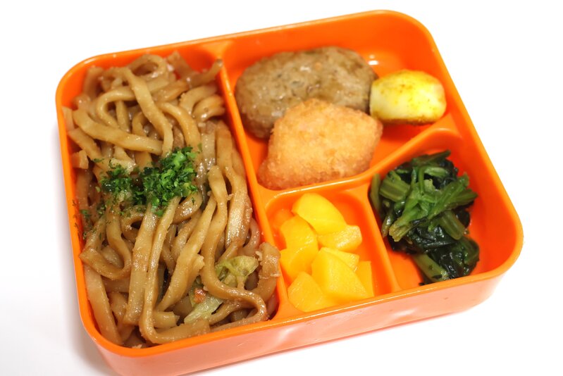 焼うどん、野菜つくね、かにかまフライ、カレー風味ポテト、ほうれん草のお浸し、黄桃缶 350kcal