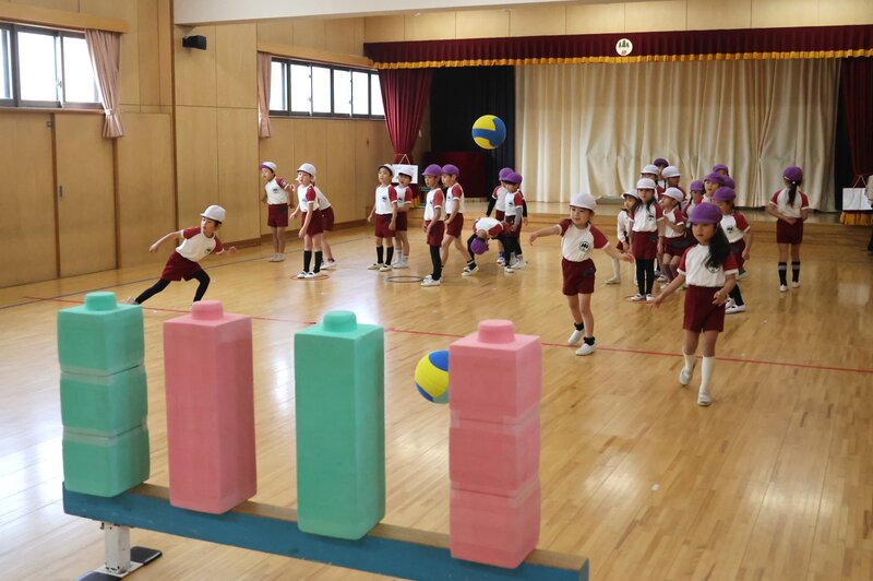 年長さんは、火曜日なので「体操指導」がありました。きょうのテーマは、「ボール投げ」。写真に写っている4つのブロックは、「まと」です。ちなみに、この場面では男子チームと女子チームにわかれて対戦中。「まと」に向かってボールを投げて、みごとブロックが倒れますと1点が与えられます。