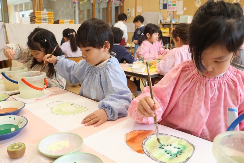 そして、きょうの最後はこちら。年中さんの「静物画」です。年中さんは、「キウイ」をテーマにして静物画を描きました。きょうは、その仕上げというわけです。