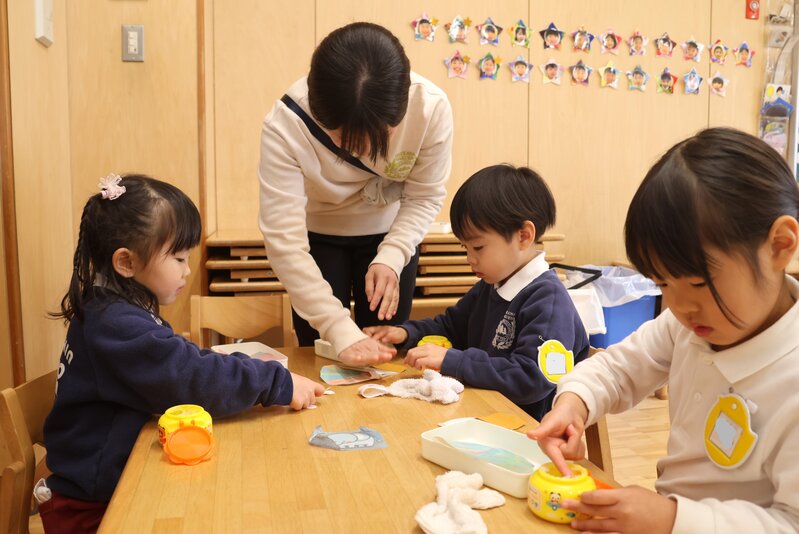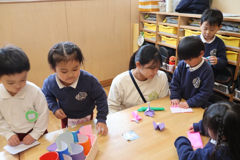 年少さんはといいますと、「くま組」さんは先生と一緒に「折り紙」でいろいろと製作中。