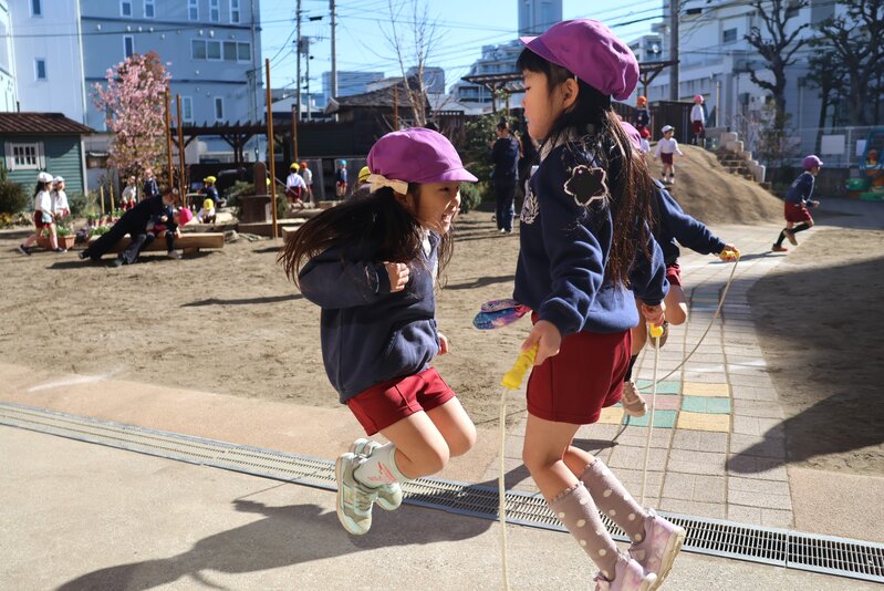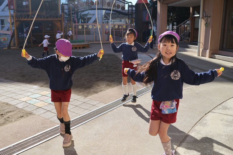 園庭では、その勢いを増しつつある陽ざしを浴びながら、年長の女の子たちが「大繩跳び」の大記録に続けとばかり、「縄跳び」の練習に励んでいました。跳ぶ「回数」も大切ですが……、