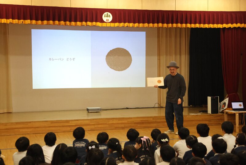では、ここからがきょうの本題です。きょうは、絵本作家であり木版工房も営む「もりといずみ」先生をお招きして、年少組を対象に「絵本の読み聞かせ」をしていただきました。きょうご紹介するもりと先生、何がすばらしいかと言いますと、その木版の技術です。木版って、皆さんは経験ありますか?jimjimは、小学生の頃に工作の授業で体験をしました。彫刻刀を使って木を彫っていき、いくつかの版を重ね合わせて1枚の作品を仕上げていく工作です。