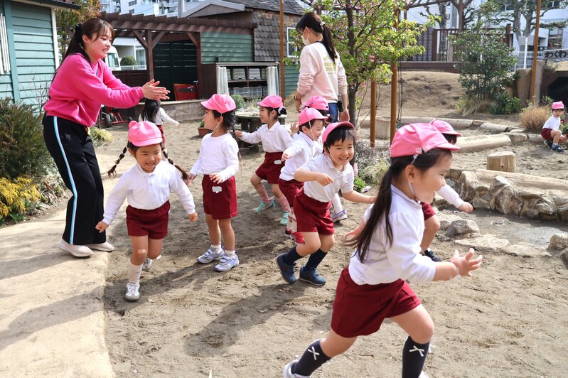 園庭では、「いちご組」さんが先生と一緒に元気にあそんでいました。「いちご組」さんの「おおかみさんごっこ」は、まだまだ続いているようです。