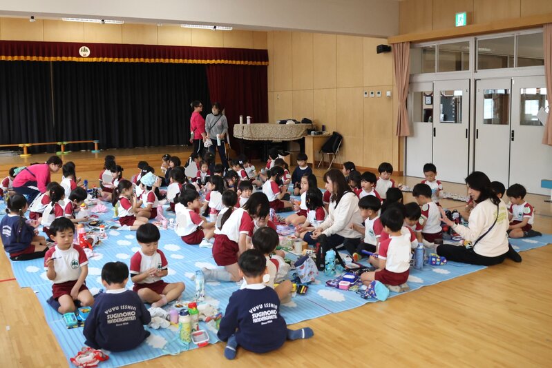 その年中さんたち、ドッジボールのあとは、3クラスがなかよく交わって「合同ランチ」を開きました。では、ここで問題です。