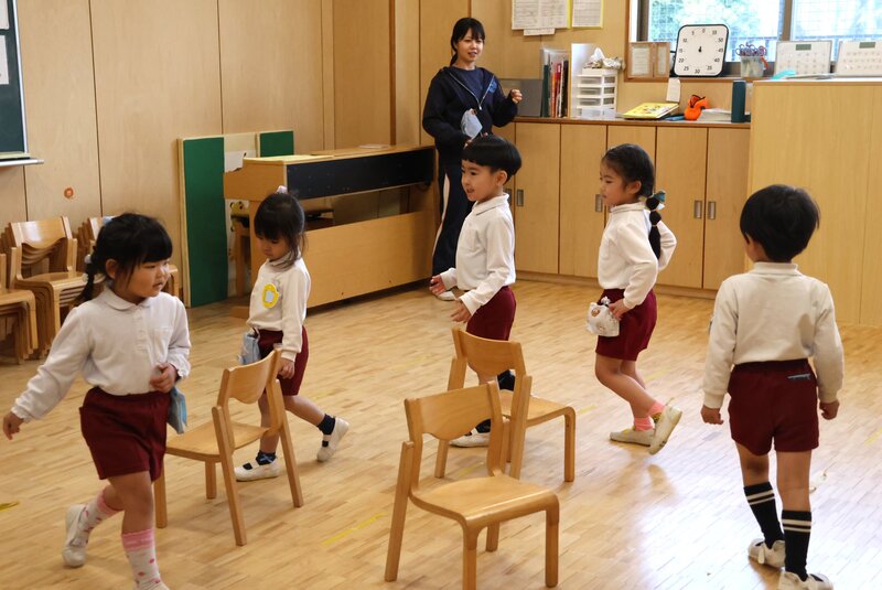 「ひよこ組」さんは、「イス取りゲーム」を楽しんでいました。だいぶイスの数が少なくなっているところをみますと、ゲームは大詰めを迎えているようです。