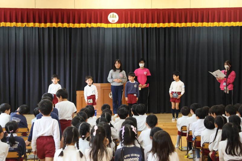 年長さんは、ホールで「卒園式」の練習を進めていました。練習にのぞむお子さまたちの表情も、練習を重ねるたびに引き締まってみえます。これもまた、成長のステップのひとつです。「卒園式」は、この子たちが体験するはじめての大舞台かもしれません。これから小学校、中学校、高校、大学と進む中で、この子たちは必ず「卒業式」を経験することになります。その「はじめの一歩」となる「卒園式」を、最上級の想い出で残してあげたい……。先生たちの胸の中は、そんな思いでいっぱいだと思います。目下、すてきな「卒園式」を目指して練習を進めている年長さんたちなのでありました。