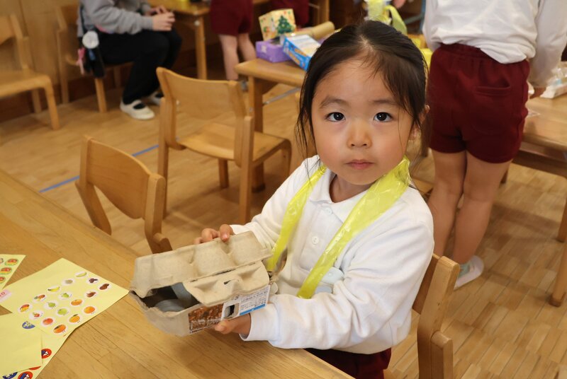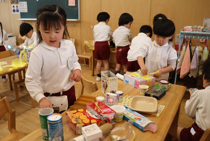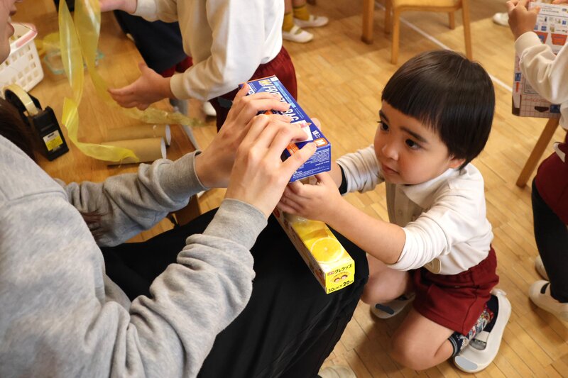 「ゴールが見えない」のは、このクラスも同じと言っていいでしょう。こちらは、「うさぎ組」さんの廃材あそびのようすです。