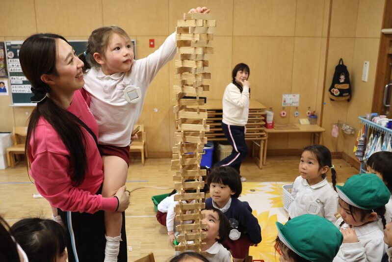崩れてしまった直後、周りで応援していた女の子が、積み上げた女の子のことを抱きしめていたんです。思わず胸が熱くなる、とてもいい場面でした。「うさぎ組」さんとしての生活も、残りわずか……。年少さんとして過ごした1年間の集大成をみせていただいた気がしました。