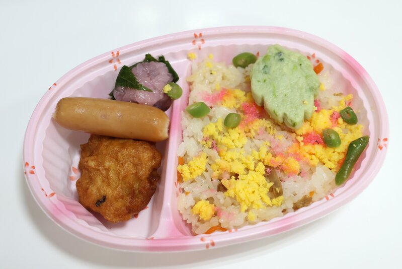 ちらし寿司、鶏のから揚げ、ウィンナー、木の葉しんじょ、さくらもち 396kcal