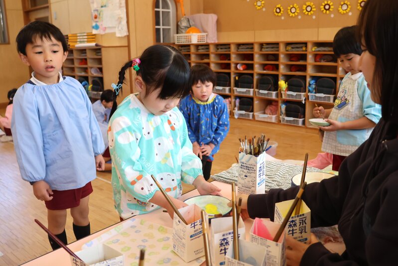 「ひまわり組」さんは、先日おこなった絵画の製作がお子さまたちに好評だったようで、きょうは「絵画製作アゲイン」ということになりました。こちらは、「絵の具スタンド」。お子さまたちが希望する色彩を、先生が調合してつくってくれます。