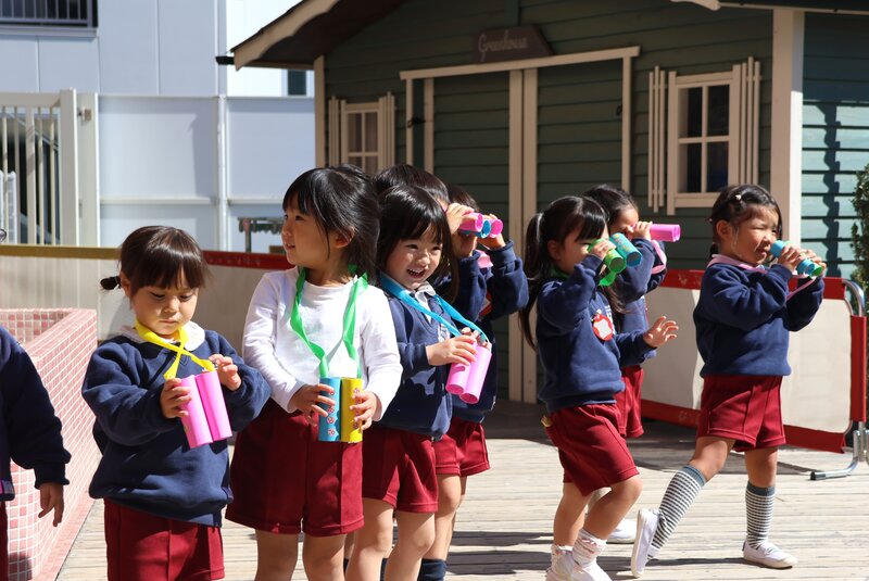 お出迎えのあとは、お部屋の前の「ひだまりテラス」に出て、お外を観察。このあと「いちご組」さんのお子さまたちは、「双眼鏡」を携えて園内探検へと出発していきました。