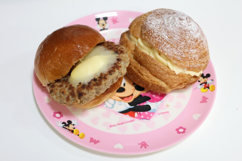 「横濱ロール(馬車道カスタード)」と「ジューシーチーズバーガー」の組み合わせ。