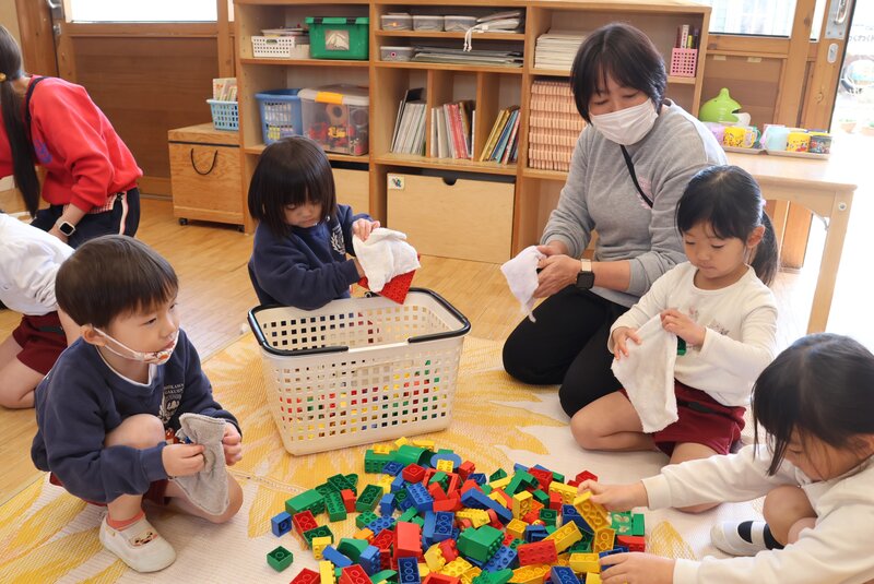 ブロックなどの細かな遊具も、ひとつひとつ丁寧に拭いてしまっていきます。