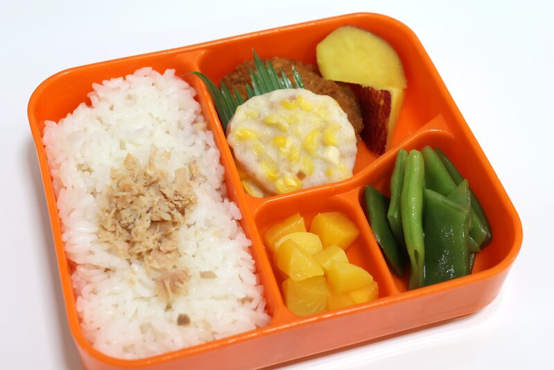 鮭ごはん、ソースカツ、マヨコーンさつま、さつま芋の甘煮、いんげんのソテー、黄桃缶、407kcal
