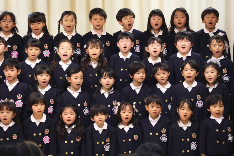 学年主任と園長のあいさつに続いて、お子さまたちの歌が披露されますと、会場は純粋で、いっさいの曇りがない透き通った空気で満たされました。子どもたちの歌声って、こんなにも心を揺さぶるものなのでしょうか。会場の保護者の皆さまの中には、手拭いで涙をぬぐう姿も……。