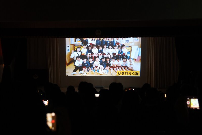 うたのあとは、3年間の幼稚園生活を振り返るスライドショーが上映されました。こちらは、担任の先生たちが毎日、一生懸命に写真を集めてつくっていた力作です。お子さまたちの成長の証しがスクリーンを通して伝わってきて、保護者の皆さまの3年間の記憶を呼び起こしていたようでした。こうして、ホールでの「全体会」が終わりますと……、
