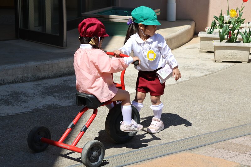 三輪車に乗ったりするときも、いたるところで「先輩」たちが新しいお友だちをやさしくサポートしてくれていました。こういう場面をみられるのが、「縦割り保育」が主体である預かり保育の良いところだと思います。新しいお友だちがちょっと転んだりしても、ちゃんと先生に教えてくれるんですよね。頼りになる先輩たちです。
