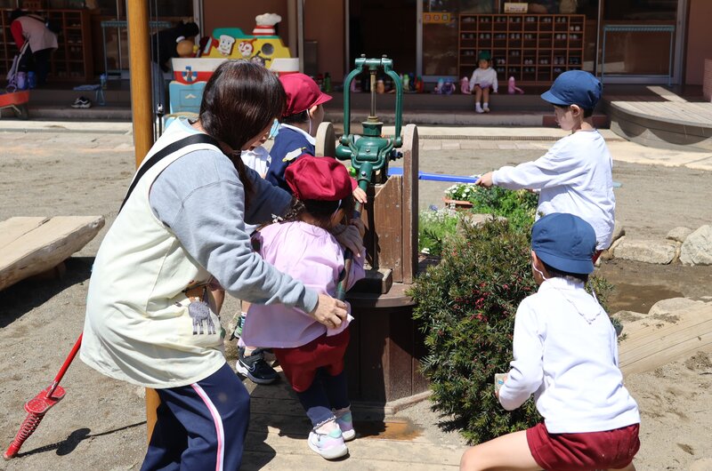 先生のお話しが終われば、さあ、待ちに待った「おあそびタイム」です。お砂場はもちろん、「のこのこやま」を登ったり下りたりするときや……、