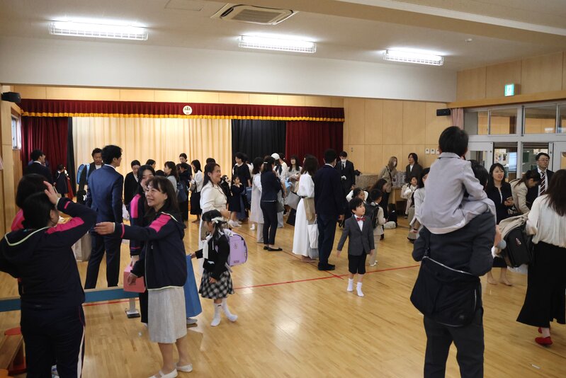 1年生たちがやって来たときは、あいにく小雨が舞うお天気でしたので、皆さんをホールへと誘導。ホールは、写真のように大勢の1年生と保護者の皆さまでにぎわいました。