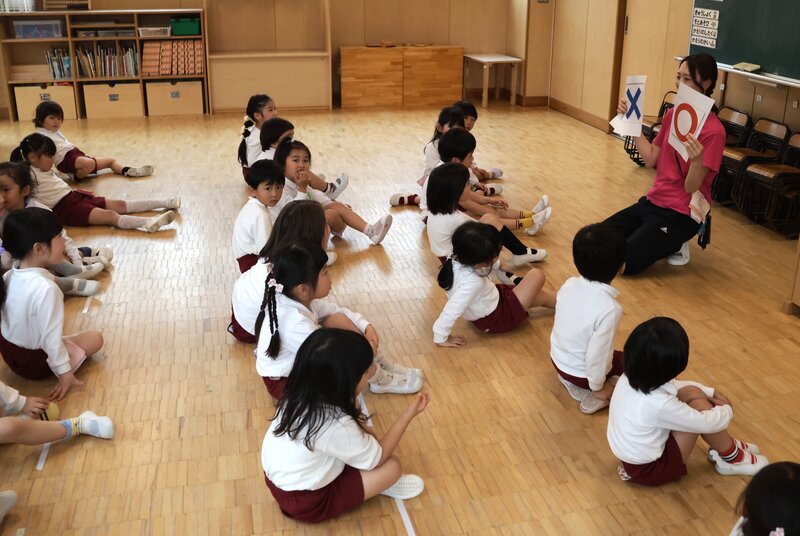 年中の「たんぽぽ組」さんに行きましたら、先生が〇と×の紙を手にしていました。どうやら、〇×ゲームをしていたようです。先生にお話を聞きましたら、来月の遠足「すぎのこde あそぼう」の準備なのだとか。いまから準備を進めていけば、きっと楽しいゲームが展開されることでしょう。