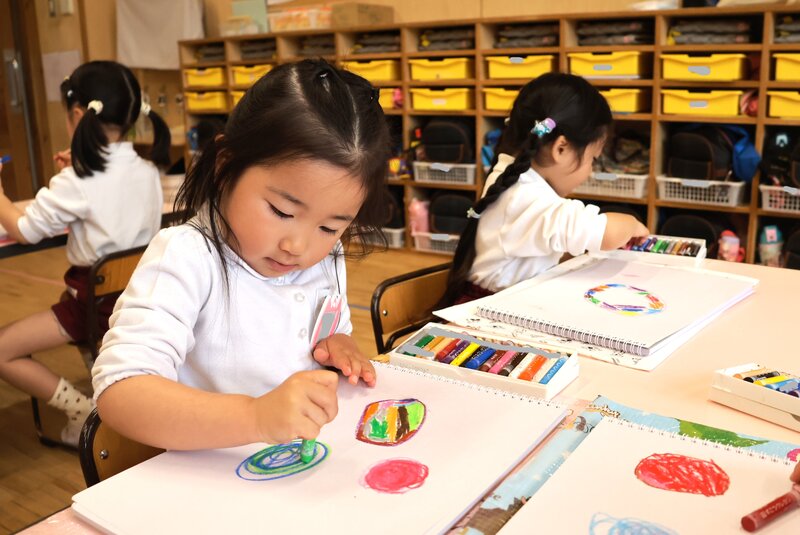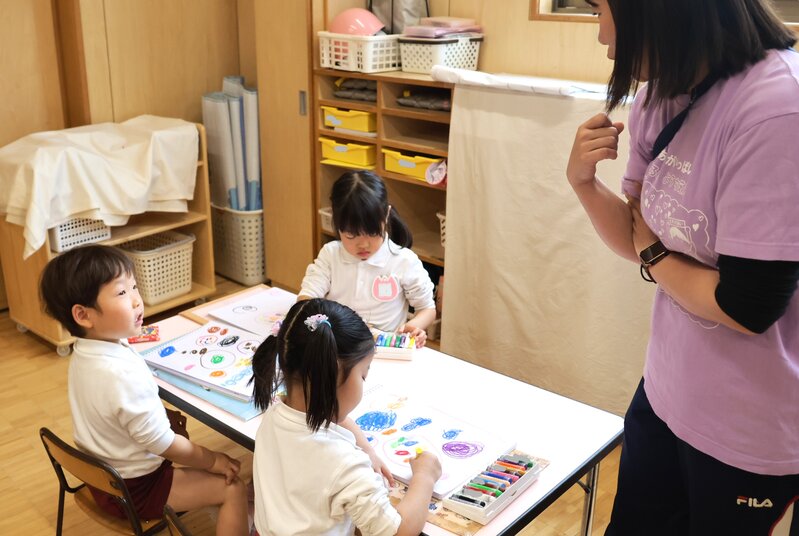 さて、こちらは年中の「ゆり組」さん。お子さまたちは、クレヨンを手にしてお絵かきをしていました。特にテーマを定めない「自由画」かと思いましたが、担任の先生に尋ねたところ、立派なテーマがありました。そのテーマとは、いったい何かおわかりになりますか?