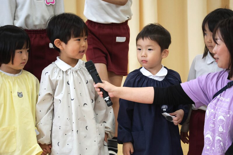 年長さんになれば、もう慣れたもの。自分でマイクを握って堂々たる姿勢でクラスとお名前を言っていました。このあと、園長先生のお話があり、園歌「すぎのこのなかまたち」をうたって閉会となりました。