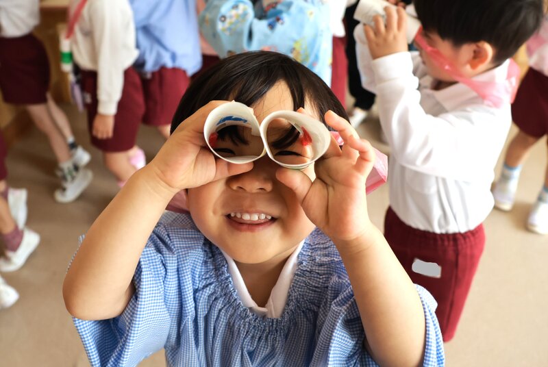 では、「きょうのすぎのこ」をお伝えしてまいりましょう。こちらは、手作りの双眼鏡を片手に「園内探検」にお出かけした年少の「りす組」さんです。職員室の前に来て、園長先生にご挨拶。園長先生のお顔を双眼鏡で覗き込むお子さまも……。