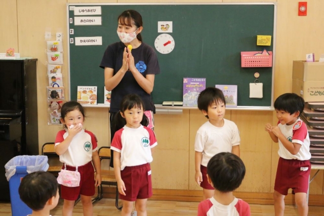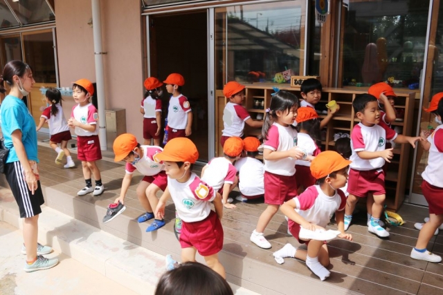 そして、きょうの本題です。きょうは、年少さんが2学期はじめての「体操指導」にのぞみました。 きょうは、前半が「くま組」「うさぎ組」「ぞう組」さん、後半が「ひよこ組」さんと「りす組」さんでしたが、ここでは織り交ぜてのご紹介となりますので、ご了承ください。