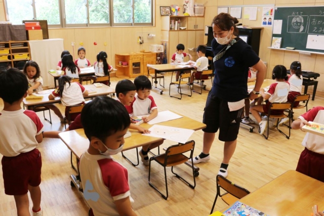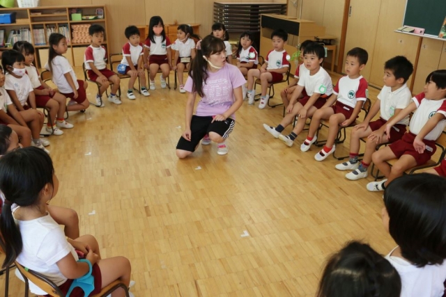 「たんぽぽ組」さんは、丸く輪になって何をしているかというと……。 「フルーツ・バスケット?」 いえ、「なんでもバスケット」です。 これは、里佳先生が「ルール」を説明している場面。「体操着を着ている人って言ったら、体操着を着ている人は、席を移動するんだよ」「お名前のバッチをつけている人って言ったら……」と、ていねいに説明して、さあゲームスタート!! みんな、一斉に移動して……。