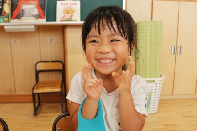 きょうは、久しぶりに雨が降りましたけど、なかなかまとまった雨になりませんね。すぐに上がってしまって、「めぐみ雨」にはほど遠い感じ。まるで、アツアツの鉄板に霧吹きで水を吹きかけているような感じです。日本の近海には、台風がふたつもあって、しばらくはきょうのようなにわか雨に注意が必要かもしれません。 さて、きょうは半日保育の水曜日。短い時間でしたが、ここしばらく「半日保育」が続いていたこともあって、どのクラスも充実した半日になったようです。 最初は、「ちゅうりっぷ組」さんの朝の会から。Jimjimは、朝の会の途中からおじゃましたので詳細はわからないのですが、こちらの4人のお子さまたちがマイクで自分の好きなものなどを話していたようで、いい感じに盛り上がっていました。 「ちゅうりっぷ組」さんは、この後に「新聞紙ジャンケン」をして、さらに「新聞紙ちぎり」までやって楽しさいっぱいだったようです。