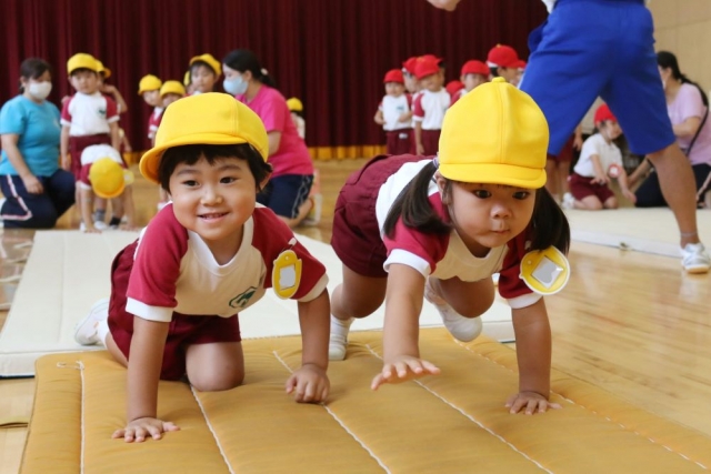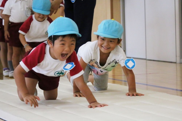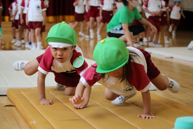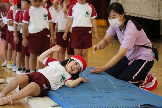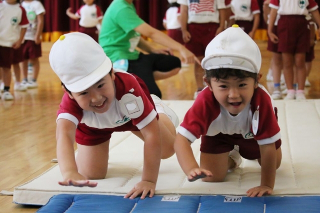 「でんぐり返し」です。「ライオンさん歩き」で前に進むイメージをつくり、「お芋コロコロ」で転がるイメージをつくったところで、いよいよ目標の「でんぐり返し」に挑戦です。 「でんぐり返し」がしやすいように、マットはゆるい下り坂になっています。これは、マットの下にはロイター板が隠してあるから。マットの上には、手をつくところに手のマークのテープが貼ってあります。 そして、蛭田先生が子どもたちに「でんぐり返し」の一番のポイントを伝えます。 そのポイントとは……。 マットに手をついたときに「おへそ」をみること。これが、「でんぐり返し」の最重要ポイントです。 さあ、準備は整いました。「でんぐり返し」に挑戦です!! うまくできる子もおりますが、それは少数で、ほとんどの皆さんはあっちに転がり、こっちに転がり……。 まっすぐに転がるのは、けっこう難しいでしょう。まっすぐに転がるように、少しずつ練習を重ねてみてください。 というわけで、きょうは年少さんの「でんぐり返し」のもようをお伝えしました。 では、また明日お会いしましょう。 By jimjim