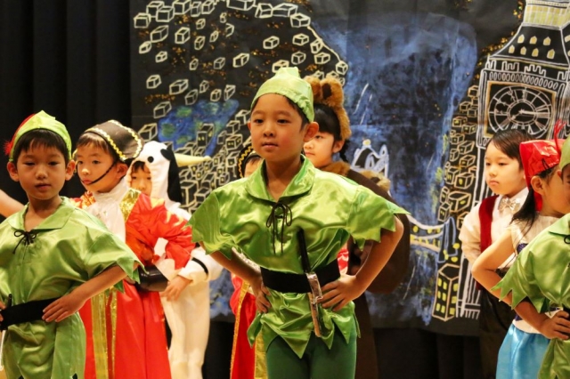 そして、最後は年長「にじ組」さんの登場です。 「にじ組」さんの「リハーサル」がはじまる直前、「うさぎ組」さんが「にじ組」さんの劇を観にホールに向かう途中で職員室の前を通りました。 ちょうど、そこにいた石毛さんが、「うさぎ組」さんの子どもたちに尋ねました。 「どこにいくの?」 「ホール」。 「何をするの?」 「ピーターマン!!」 そして、こちらがその「ピーターマン」であります。いえ、「ピーターパン」でした。