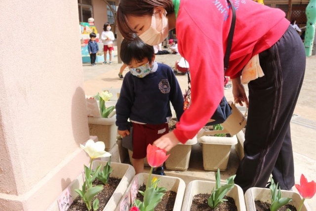 桜の花の代わりになるかどうかわかりませんが、冬のはじまりの頃に園庭のプランターに植えた「ちゅうりっぷ」が、花をつけはじめました。 まだ「つぼみ」もたくさん残っていますので、新しいお友だちのご入園まで待っていてくれたらいいなと思います。やっぱり、お花のある景色でお迎えしたいですものね。