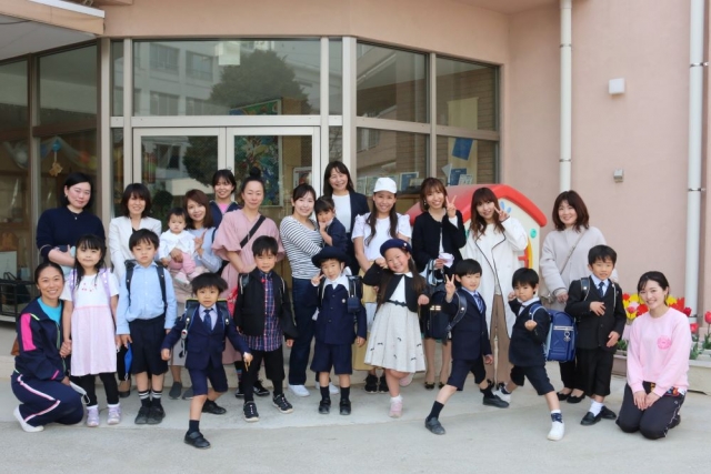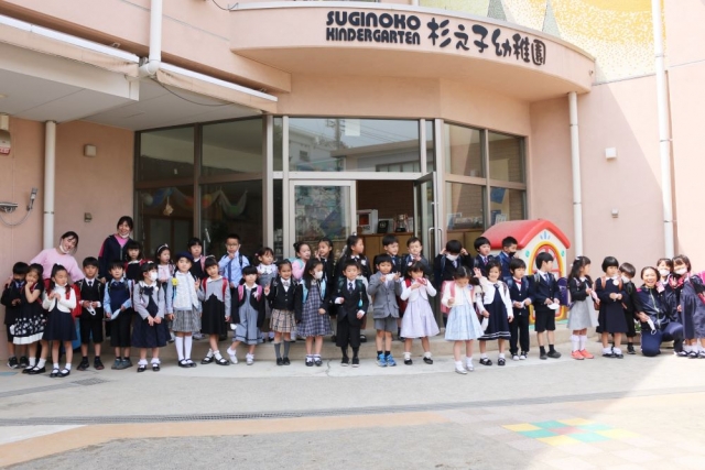 新年度がはじまり、4月1日に初日の経過報告をさせていただいて以降、このコーナーは事情によりお休みをさせていただいておりましたが、きょうは、3月に杉之子を巣立ったお子さまたちが「小学生」になって戻ってきてくれましたので、そのようすをお届けしたいと思います。 杉之子幼稚園のすぐ目の前には西前小学校があり、近隣には平沼小学校、戸部小学校、稲荷台小学校、一本松小学校、富士見台小学校、本町小学校、本町みなとみらい小学校などもあります。これらの小学校が杉之子からの主な進学先で、その他には隣接区の小学校や私立小学校に進むお子さまもおります。 きょうは、それらの小学校に進学した「ピカピカの1年生」たちがやって来てくれました。まだ少し大きめに感じられるランドセルを背負いながら、晴れの衣装に身を包んだ1年生の皆さん。そのランドセルを背負いながら、さっそく幼稚園のときに親しんだ「ホッピング」や「三輪車」であそぶ姿もみられ、まだまだ「杉之子気分」は抜けきらないようでした。 そんな1年生の皆さまを出迎えた杉之子の先生たち。「おめでとう!!」とお祝いの言葉をかけながら、教え子たちとの再会をよろこびあい、一緒に記念撮影です。 ご覧ください、この人数……。うれしいですね、こんなにたくさんの1年生が来てくれたんです。