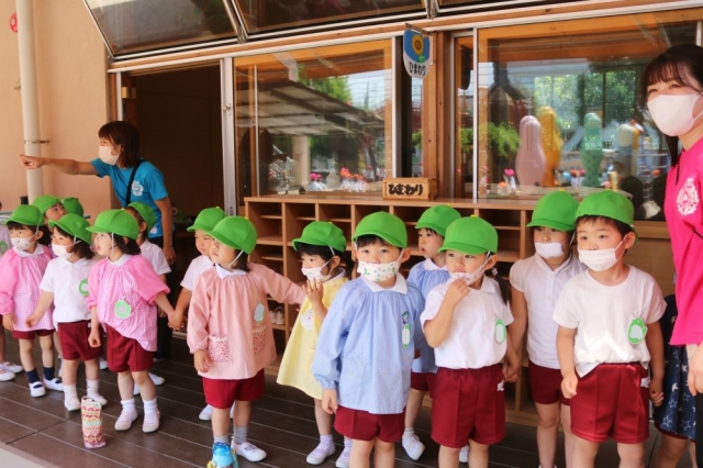 先日、幼稚園のフェンスを彩る「テイカカズラ」のお話しをしました。フェンス一面に咲く可憐なお花はかわいらしいかぎりなのですが、実は、花が咲き終わった後ことがjimjimの頭を悩ませています。 それは、何かといいますと……。 「ツル」です。このテイカカズラ、「ツル」が伸びるのがものすごく早いんです。10日間放ったらかしにしただけで、50~60㎝は伸びます。ということは、おそらく一日に5㎝は伸びているということです。しかも、ツルの切断面から白い液が出てきて、これが服に付きますと落ちません。まったく厄介なのであります。 切っては伸び、切手は伸び……。まもなく、この繰り返しが10月くらいまで繰り広げられることになります。それはまさに、テイカカズラとjimjimとの根比べ。 よ~し、テイカカズラになんか負けないぞー!! では、「きょうのすぎのこ」に話を移しましょう。きょうも、きのうに続いていいお天気でした。年少の「くま組」さんは、担任の凜桜先生と補助の佐々木先生と一緒に「園内探険」にお出かけしました。 写真は、その「くま組」さんが年中さんのお部屋の前に来たところです。みんなで「園庭」のほうを見ていますね。 いったい、園庭では何が起こっているのかといいますと……。