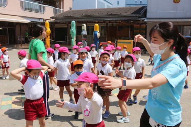 園庭には、陽先生の放水を受けてわざと水を浴びに来るお子さまや、「ワーッ!!」とか「キャーッ!!」などの「よろこびの声」をあげながら逃げ惑うお子さまたちがいっぱい。