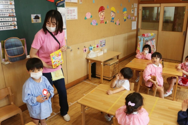 こちらの写真は、「にじ組」さんです。一見すると、ふだんのクラスのようすに見えますが、実は「にじ組」さんである「ミッション」が進行中なのであります。 それは、何かといいますと……。 「宝さがし」です。まず、亜津実先生が園舎内に「ヒミツの手紙」を隠します。それをお子さまたちが探すわけですが、やみくもに探すと時間がかかりますので、亜津実先生は「ヒント」を書いたメモをお子さまたちに渡しました。そのメモを頼りに「ヒミツの手紙」を探すと、なんと「ヒミツの手紙」は6枚あって、それぞれの手紙には「ひらがな」が一文字だけ書かれていました。 その文字を組み合わせると、「めいろはうす」という言葉が浮かび上がってきました。「どうやら、宝物の「鍵」は「めいろはうす」にあるらしい」ということになり、お子さまたちは、われ先にと「めいろはうす」を目指します。 すると……。 だれかが、「あったー!!」と声をあげました。そう、最後のお手紙が出てきたのです。 そのお手紙に書かれていたこととは……。 それは、お子さまたちのヒミツということにしておきましょう。最後は、「宝物」をみつけたご褒美に、亜津実先生からお子さまたちにすてきなシールがプレゼントされました。 この亜津実先生とお子さまたちとのあたたかな心の交流こそが、一番の「宝物」かもしれませんね。