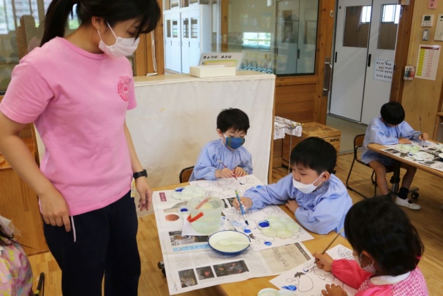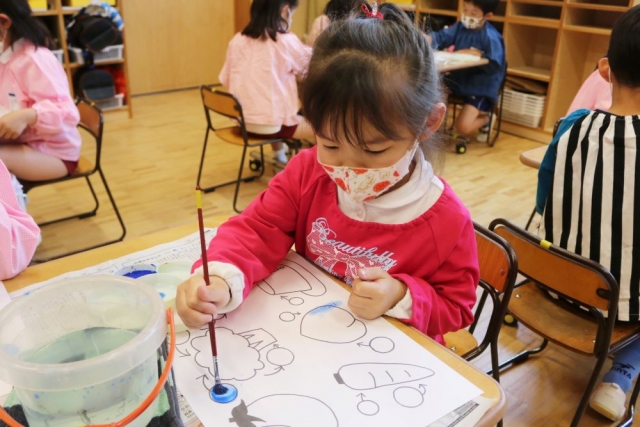 そのあとに絵の具を混ぜる工程があり、写真にはありませんが、きょうは「オレンジ」と「水色」をつくったそうです。 さて、この「オレンジ」と「水色」を使って、お子さまたちはいったいどの絵柄に色をつけたのでしょう。それは、お子さまたちに聞いてみてください。