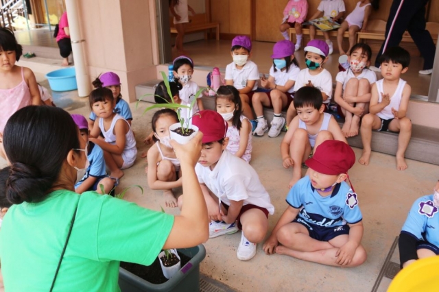 そして、こちらは「つき組」さんです。杉之子では、毎年この時期にすべてのクラスで「栽培」にとりかかります。「つき組」さんは、そのトップを切って「栽培」のための「苗」を植えました。 「つき組」さんが選んだ「苗」の種類はといいますと……。 「トウモロコシ」と「ミニトマト」です。これから夏休み前まで一生懸命に栽培に取組み、最後は収穫して食べるのがゴールとなります。おいしい「トウモロコシ」と「ミニトマト」ができるように、愛情を込めて一生懸命に育ててあげてくださいね。 ところで……。 「栽培」の準備なのに、なぜか「水あそび用」の服に着替えているお子さまがチラホラと見受けられます。 「これは、いったいどういうこと?」と思いましたら……。