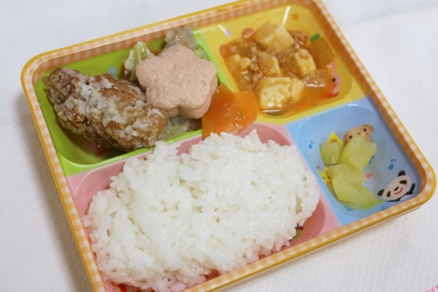 というわけで、きょうの給食はこちらです。 ごはん 麻婆豆腐 鶏肉の竜田揚げ 肉野菜炒め 花型がんも りんご缶 395kcal ごちそうさまでした。