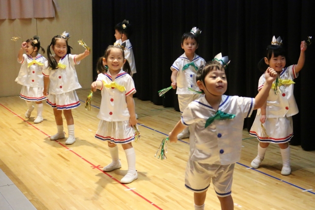 2曲目は、「えがおのまほう」です。この曲では、途中で全員が一列に並ぶ場面があります。年少さんですと、わかりやすいように「前後の移動」が多く取り入れられるのですが、その中にあって一列になる場面は、とてもいい「アクセント」になっていたと思います。 このあたりに担任の陽先生の「思い」が詰まっていたのかもしれません。「りす組」さん、とてもすばらしいステージでした。