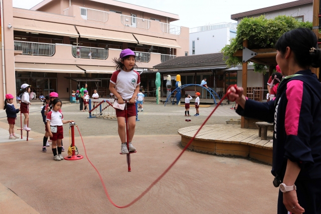 年中さんの3学期からホッピングに目覚めた女の子たち。その後、ホッピングにすっかりはまって練習に練習を重ね、みるみる上達しています。 きょうは、そのホッピングをしながらの「大繩」にチャレンジ。そして、これを見事にクリアしていました。 次は、どのような目標を掲げているのでしょう。さらなるレベルアップが楽しみです。