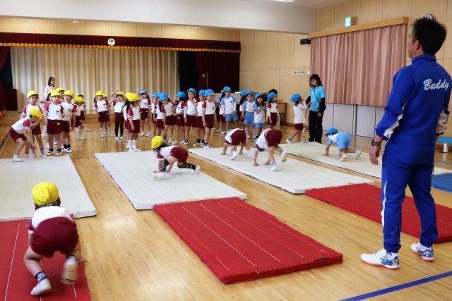 年長さんは、きょうから正課の「体操指導」がはじまりました。年長さんにとりましては、いわば「デビュー戦」となります。そのデビュー戦に蛭田先生が用意したメニューは、マット運動でした。 うしろ向きと前向きの「ライオンさん歩き」や「お芋コロコロ」などをしながら、久しぶりの体操でからだを動かしていました。
