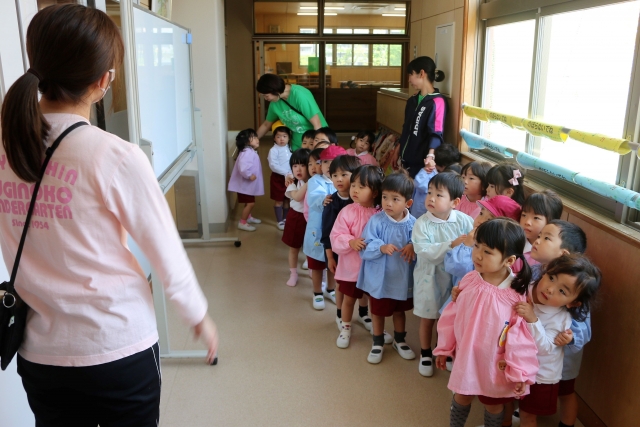 その年少さんでは、各クラスの先陣を切って真優実先生率いる「ひよこ組」さんが、「園内探険」にお出かけしました。 1階から階段を登って2階へと向かったわけですが、この慣れない階段を登るようすが、またかわいらしい……。 手すりにつかまりながら、たどたどしい足取りで登る一段は、まるでお子さまが自分の成長の階段を登るようです。 こうして2階にたどり着いた「ひよこ組」さんは、年長さんが体操をしているホールの横から年中さんの「たんぽぽ組」さんを経て、年長さんのお部屋へと向かいました。 最後は、1階に降りてきて職員室の先生たちにご挨拶。お互いに「よろしくお願いします」の言葉をかけあいました。