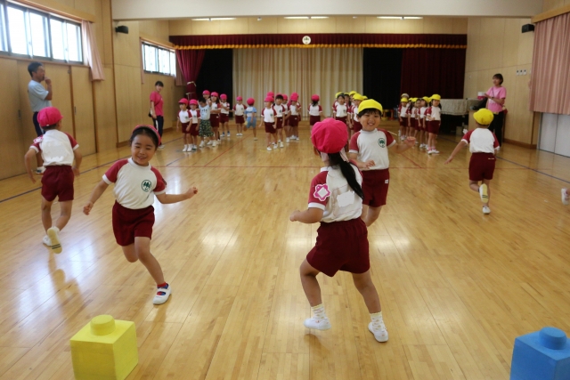 さて、きょうは火曜日ということで年長組の体操指導がありました。きょうは、1学期の最後の指導ということで、「すぎりんぴっく」関連のメニューではなく、通常の体操指導となりました。 今回、蛭田先生が用意したのは、「走る」メニュー。床に置かれた「ブロック」を走ってまわるという内容ですが、ポイントは「走り方」です。 ふつうの走り方からはじまって、「スキップ」「ギャロップ」「ケンケン」と、さまざまな走り方で進めていきます。しかも、1周ではありません。何周もします。かなりの運動量になったのではないでしょうか。 そして、最後はお楽しみの「ドッジボール」で締めくくりとなりました。 「締めくくり」といえば……。