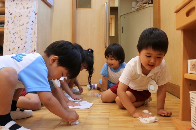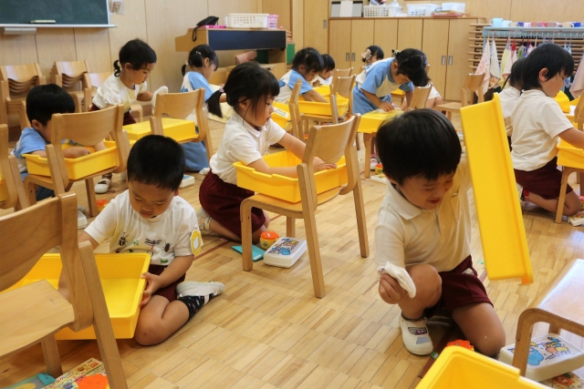 年中さんも大掃除。年中さんになりますと、何回か「大掃除」を経験しているせいか、なんとなく手際がいいです。
