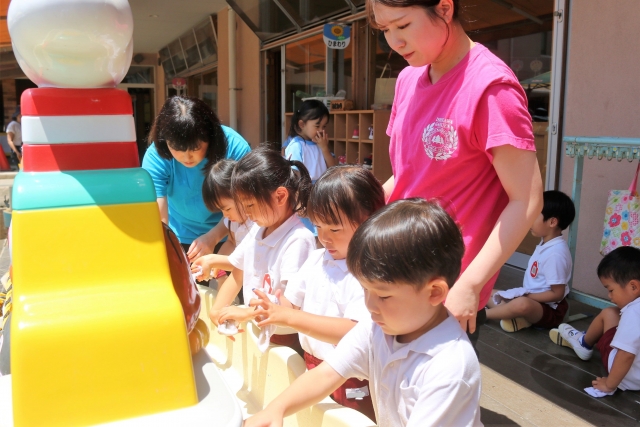 汚れた雑巾は、アンパンマン水道できれいに洗います。雑巾を絞るのは、ちょっとちからが必要なので先生がヘルプしてくれました。